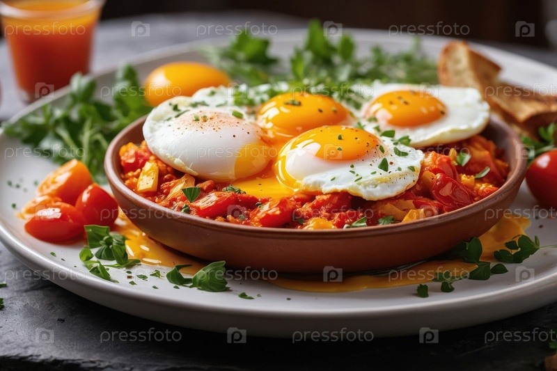 AI Generative Shakshuka with scrambled fried eggs, сердечная вкусная традиционная кулинарная бранчевая кухня