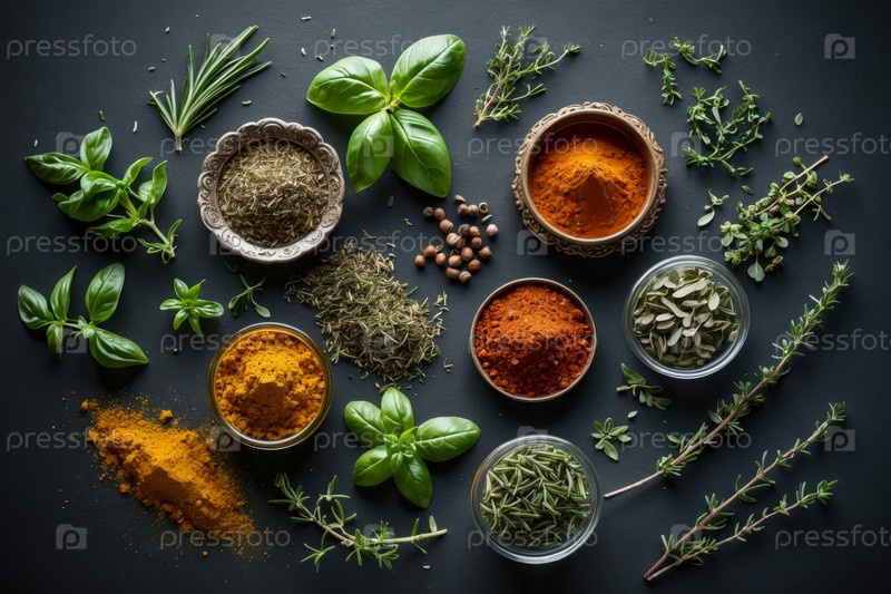 AI Generative Различные многие ароматические вкусы сухие специи порошковые кучи ассортимент в стеклянных банках миски