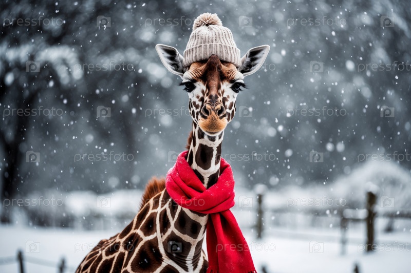 Портрет жирафа в вязанной зимней одежде шляпе и шарфе, животное в снежных дождях зимой AI Generative