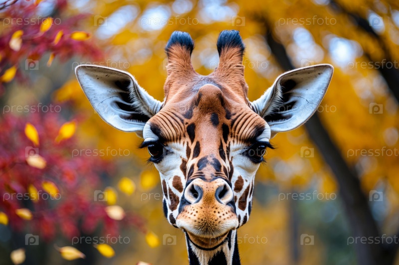 Жираф в трикотажном свитере осенний лесный фон, животное в красно-желтых листьях AI Generative