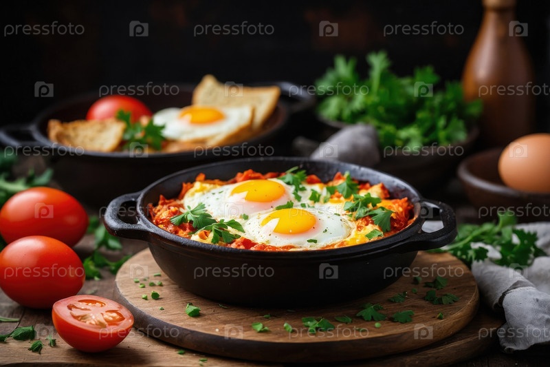 AI Generative Shakshuka with scrambled fried eggs, сердечная вкусная традиционная кулинарная бранчевая кухня