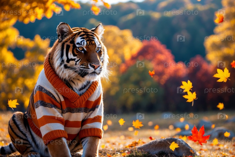 Тигр в трикотажном свитере осенний лесный фон, животное в красно-желтых листьях AI Generative
