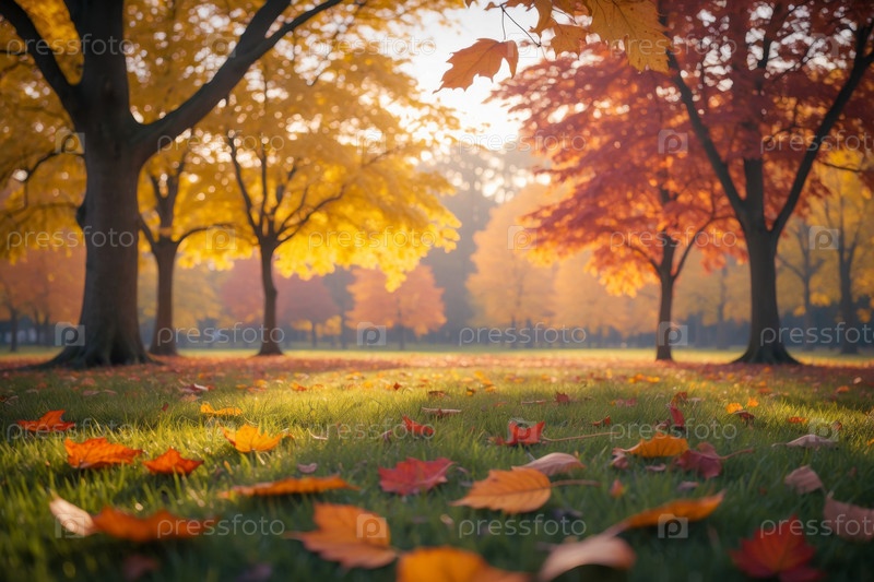 AI Generative Осенний атмосферный фон с желтыми и красными листьями, лист лежит на земле в лесном парке