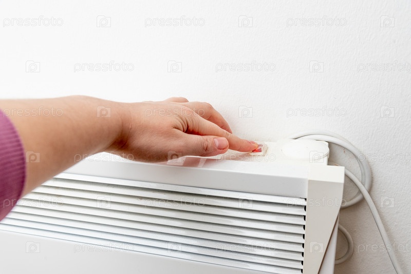 Женщина нажимает кнопку, чтобы включить электрическую батарею, отопление зимой в Европе