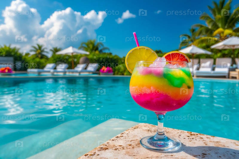 Алкогольный коктейль на заднем плане бассейна, летний фруктовый напиток в отпуске морской океан AI Generative