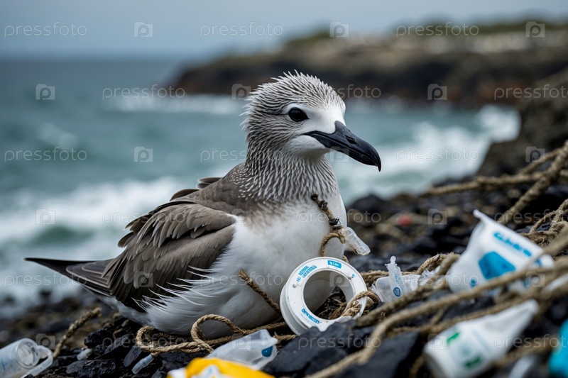 Морские медведи запутались в рыболовных сетях, загрязнение окружающей среды на свалке, вред животным AI Generative