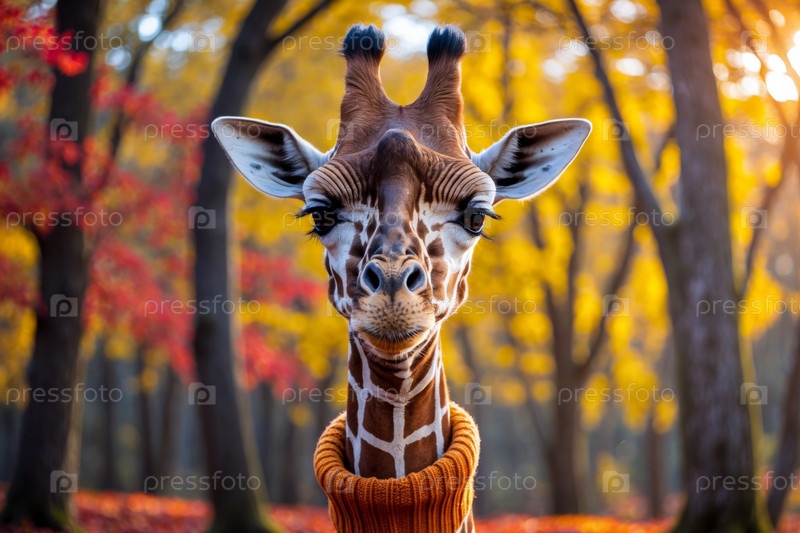 ИИ генеративный жираф в трикотажном свитере на осеннем лесном фоне, животное в красно-желтой листьях