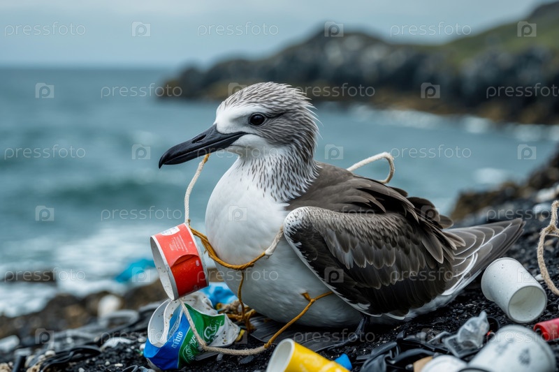 Морские медведи запутались в рыболовных сетях, загрязнение окружающей среды на свалке, вред животным AI Generative