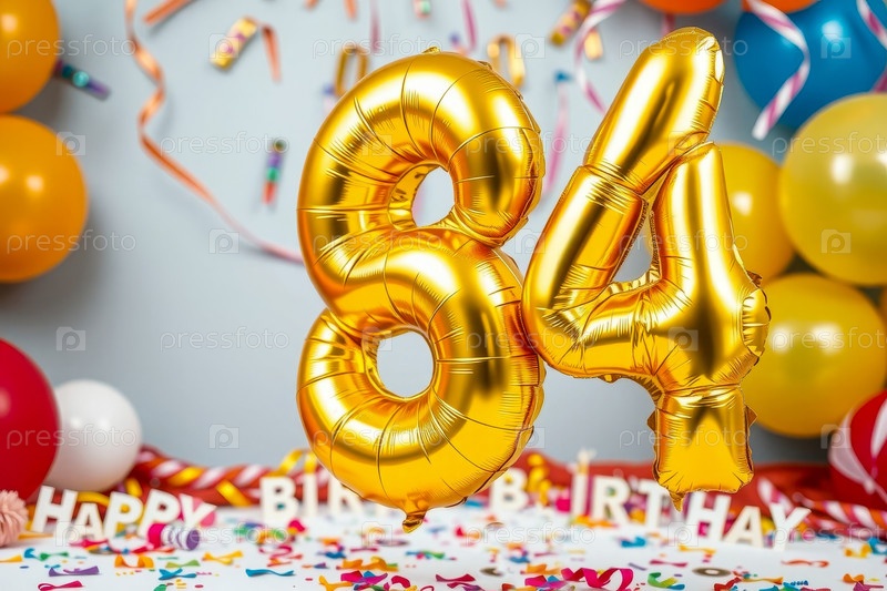 Гелиевый баллон на день рождения номер восемьдесят четыре, фигура золотых букв 84 праздник праздничный фон