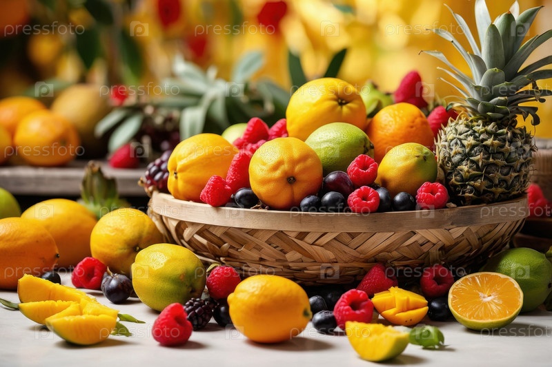 Различные фрукты на столе, крупный план ароматических органических свежих натуральных ягод AI Generative