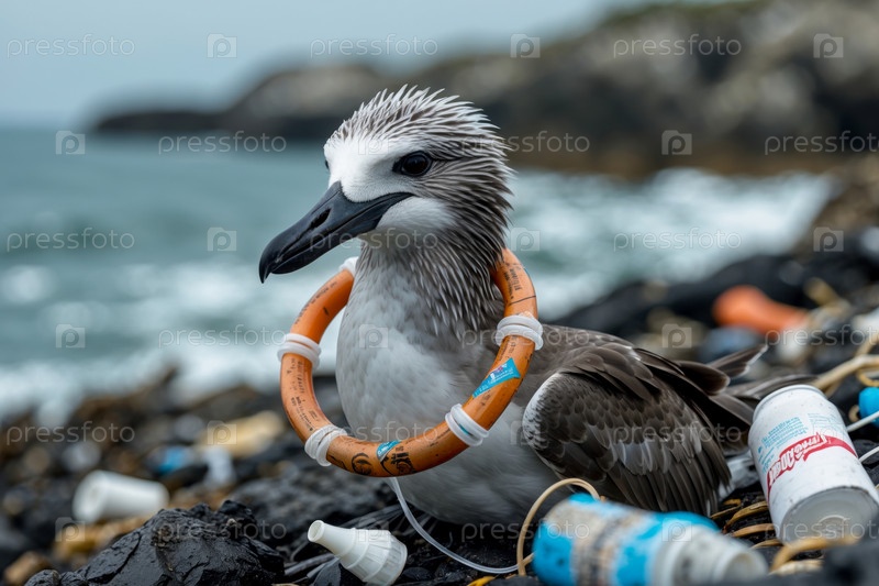 Морские медведи запутались в рыболовных сетях, загрязнение окружающей среды на свалке, вред животным AI Generative