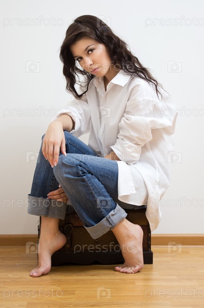 Красивая брюнетка, сидящая на сундуке