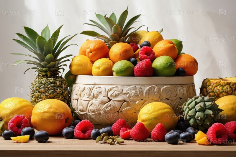 Различные фрукты на столе, крупный план ароматических органических свежих натуральных ягод AI Generative