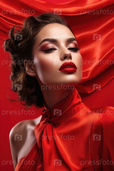 ИИ генеративный портрет молодой женщины в ярко-красном платье и помада макияж, модная модель красоты