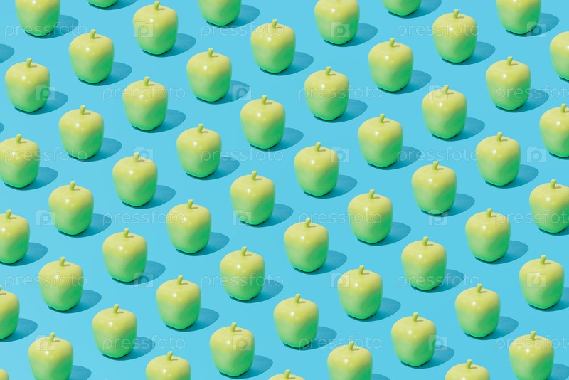 Творческий абстрактный летний яблочный рисунок плоский лежит на пастельно-синем фоне минимализма