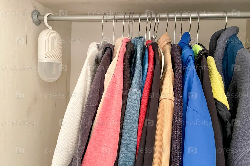 Портативный осушительный обезвоживатель висит в шкафу с одеждой, рубашками и джемперами