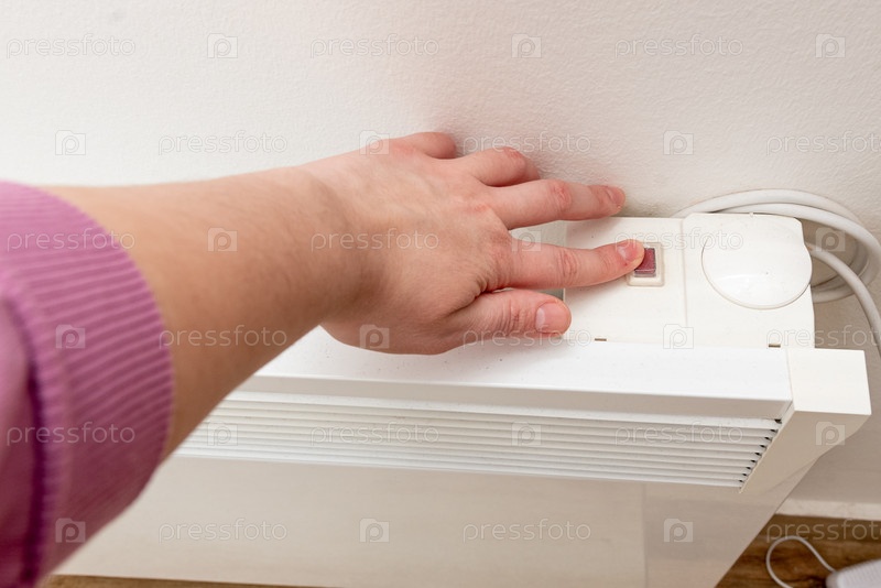 Женщина нажимает кнопку для включения электрической батареи, отопления зимой в Европе