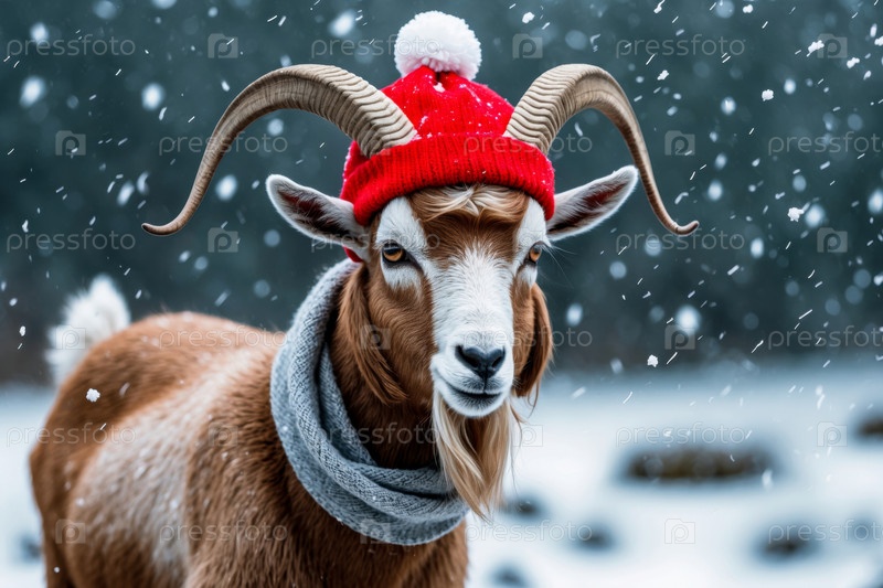 Портрет козы в вязанной зимней одежде шляпы и шарфа, животное в снежных дождях зимой AI Generative
