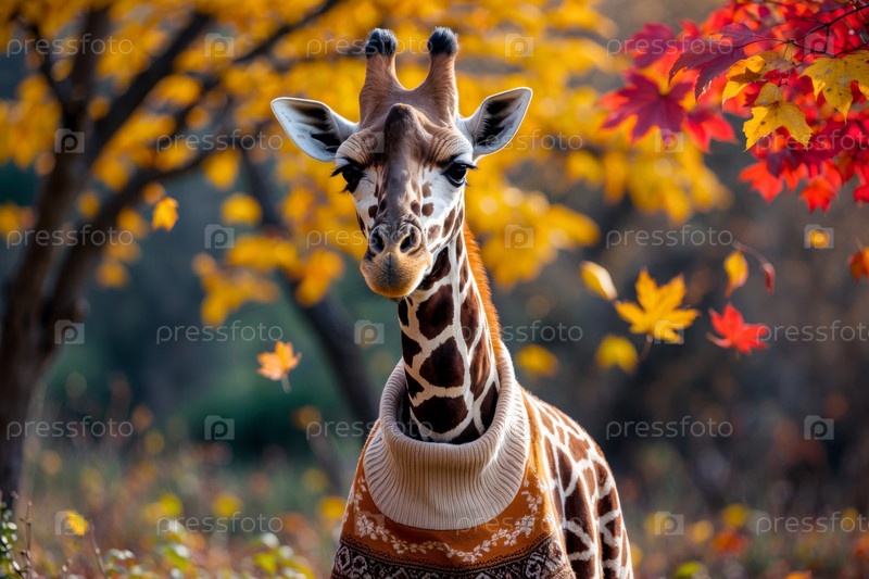 ИИ генеративный жираф в трикотажном свитере на осеннем лесном фоне, животное в красно-желтой листьях