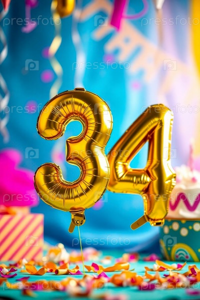 Гелий день рождения воздушный шар формы номер тридцать четыре, золотые буквы фигура 34 праздник праздничный фон декор