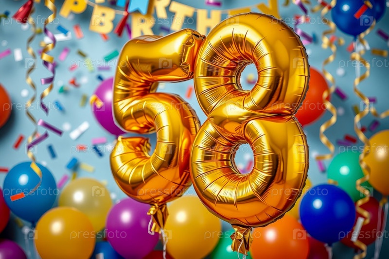 Гелиевый баллон на день рождения номер пятьдесят восемь, фигура из золотых букв 58 праздник праздничный фон