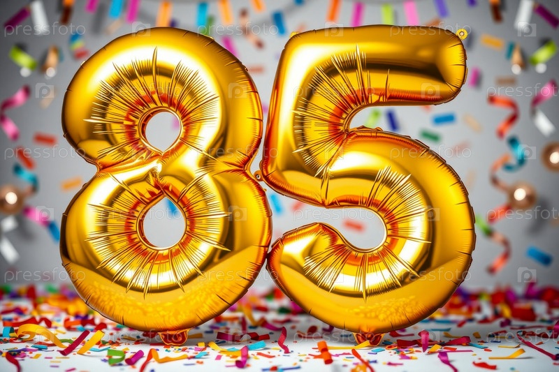 Гелиевый баллон на день рождения номер восемьдесят пять, фигура золотых букв 85 праздник праздничный фон