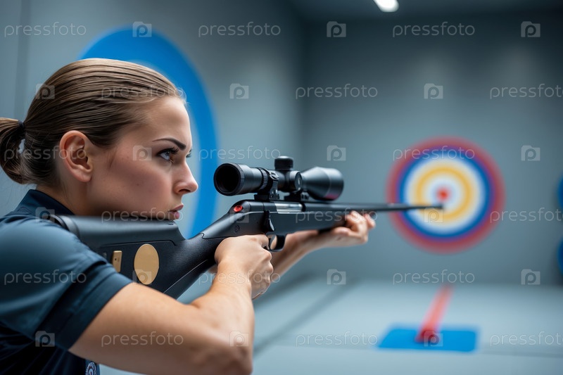 Женщина-спортсменка стреляет из винтовки в цель, летние Олимпийские игры Чемпионат соревнований AI Generative