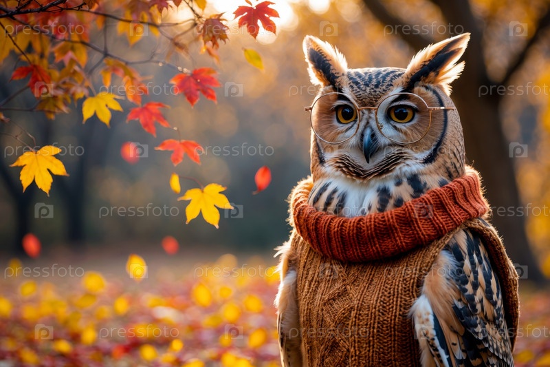AI Generative Сова в трикотажном свитере на осеннем лесном фоне, животное с красными и желтыми листьями