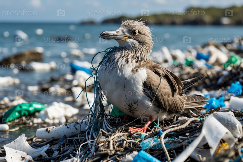 AI Generative Seabird чайки запутались в рыболовных сетях, свалках загрязнение окружающей среды, повреждение животных