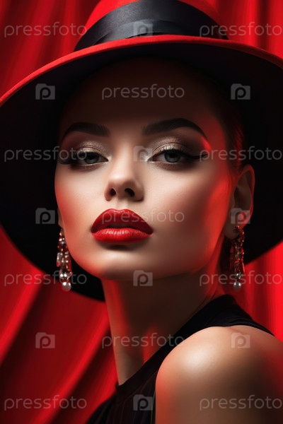 ИИ генеративный портрет молодой женщины в ярко-красном платье и помада макияж, модная модель красоты