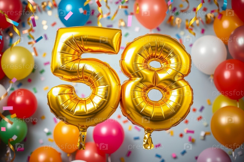 Гелиевый баллон на день рождения номер пятьдесят восемь, фигура из золотых букв 58 праздник праздничный фон