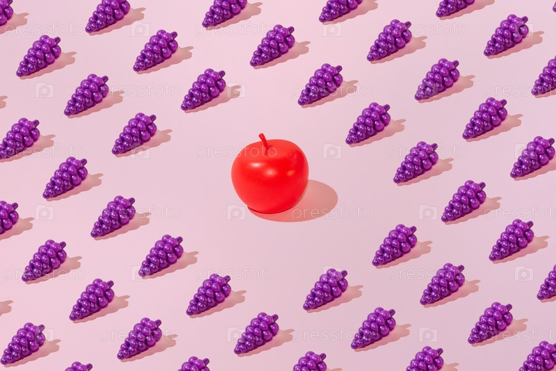 Творческий абстрактный летний виноград и яблочный рисунок с плоским укладкой на пастельном розовом фоне минимализма