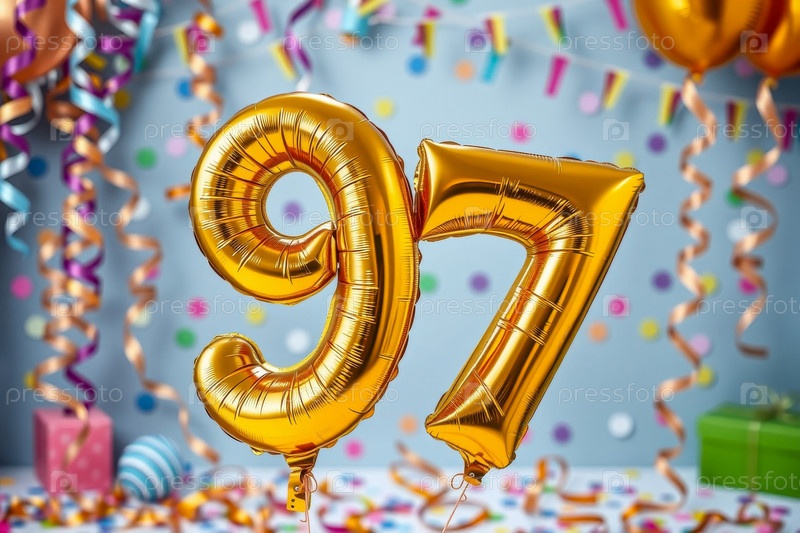 Гелий день рождения воздушный шар формы номер девяносто семь, золотые буквы фигура 97 праздник праздничный фон декор