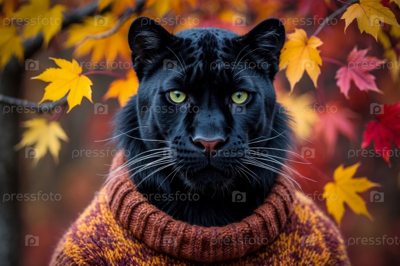 AI Generative Panther в трикотажном свитере на осеннем лесном фоне, животное в красно-желтых листьях