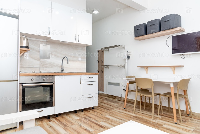 Уютный стиль минималистской легкой кухни интерьер в небольшом комнате для студийных квартир