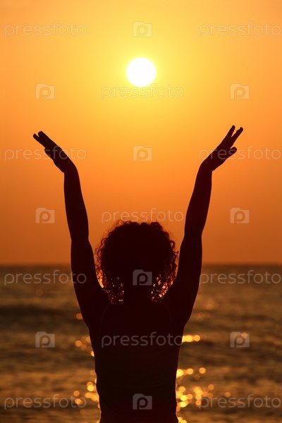 Красивая молодая женщина, стоящая на пляже и наблюдающая за закатом солнца, поднимает голову