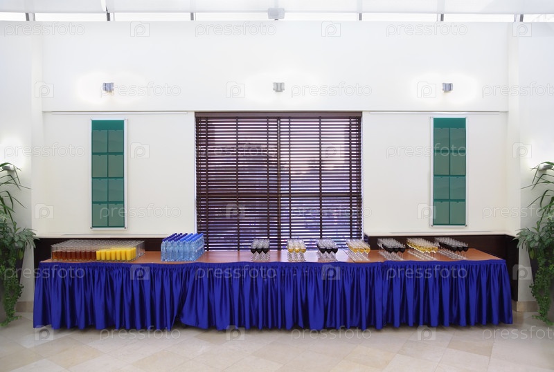Ряд чашек и стаканов для напитков находятся на длинном столе с красивым синим