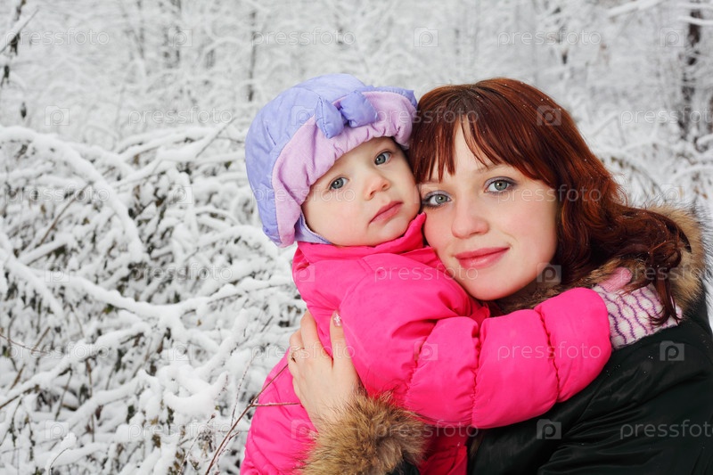 Снежные одеяла покрывают деревья за женщиной и ребенком