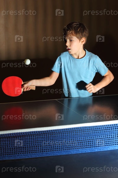 Маленький мальчик в синей рубашке, играющий в пинг-понг; сосредоточенное лицо;
