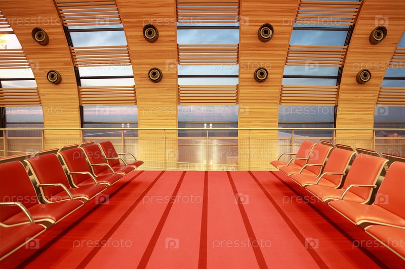 Пустой зал ожидания в международном аэропорту Шарля де Голля, красный пол и кресло