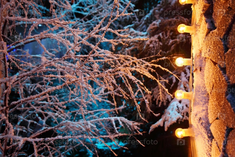 Связанные морозом ветви светятся рядом с теплыми, струнными огнями