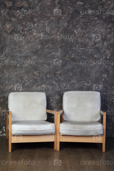 Два соответствующих деревянных стула с серой обивкой сидят бок о бок