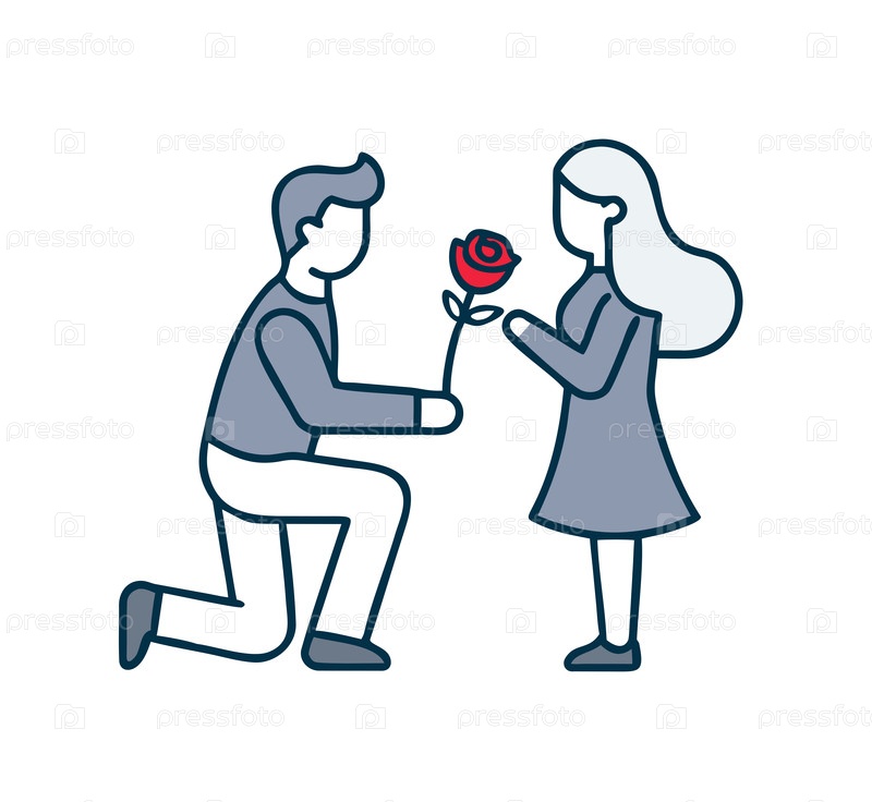 Мужчина на коленях дарит женщине красную розу, представляя концепции предложения, любви, романтики, свиданий и партнерства