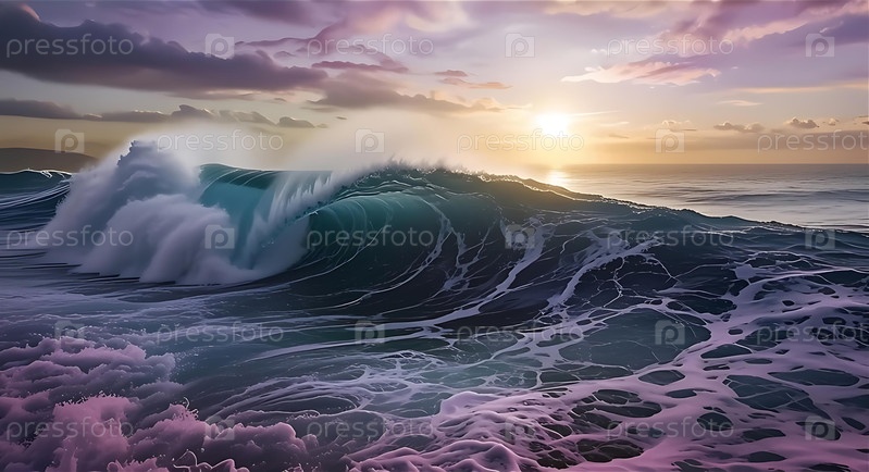 Океаническая волна, разбивающаяся белой пеной против ярко-фиолетового и оранжевого заката неба, создает мощную сцену природы