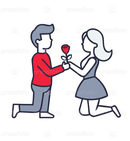 Мужчина на коленях дарит женщине красную розу, представляя концепции предложения, любви, романтики, свиданий и партнерства