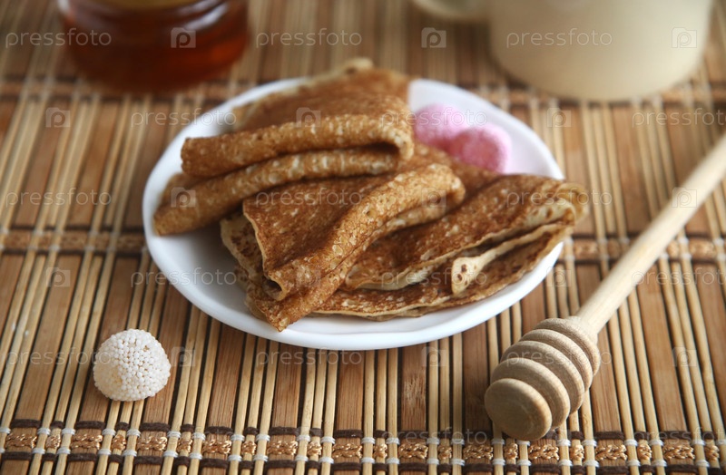 Вкусные блины, банка меда и мешалка на бамбуковом коврике, крупный план