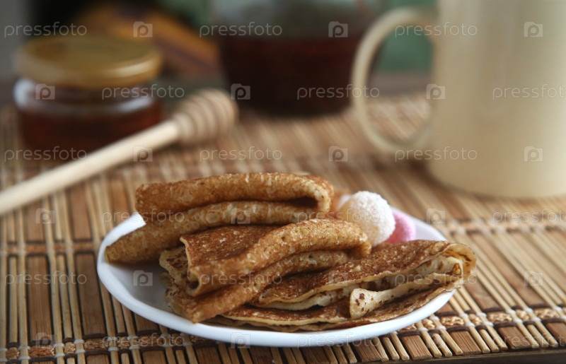 Вкусные блины, банка меда и мешалка на бамбуковом коврике, крупный план