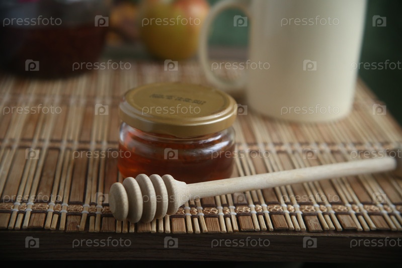 Банка меда и деревянная мешалка на бамбуковом коврике, крупный план
