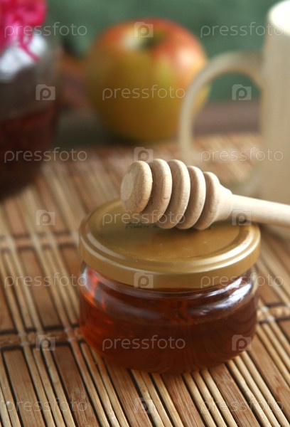 Банка меда и деревянная мешалка на бамбуковом коврике, крупный план