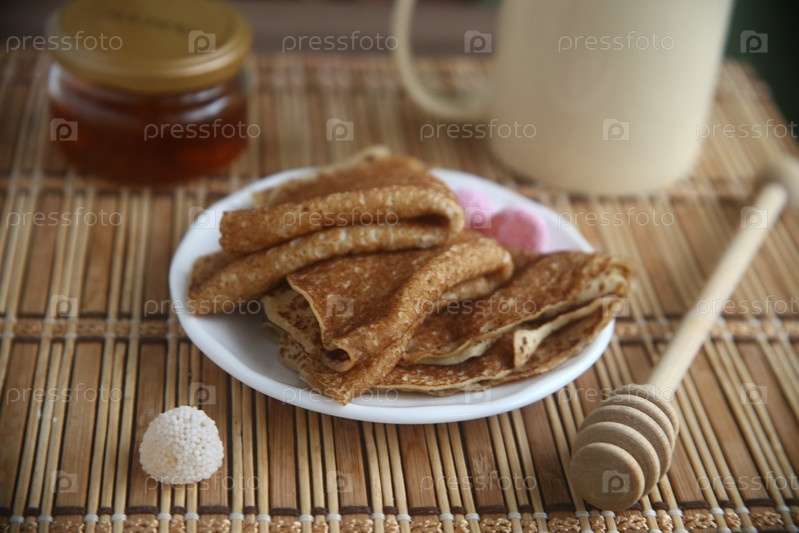 Банка меда, вкусные блины и мешалка на бамбуковом коврике, крупный план